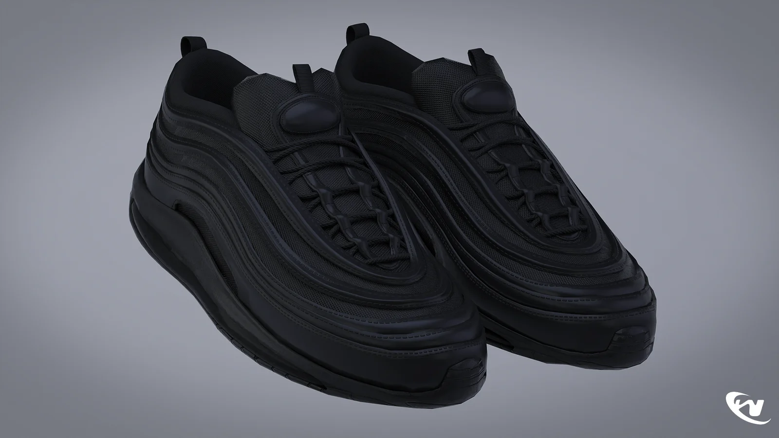 This asset provides a rigged 3D model of 97s style sneakers. The model is provided in FBX format with clean topology and UV mapping. It includes 20 PBR textures and four specific texture maps: Metallic, OpenGL Normal, Roughness, and Alpha/Opacity. Each shoe consists of 6,087 polygons, totaling 12,174 polygons for the complete pair. The mesh is fully rigged and weight-painted for integration into character setups.