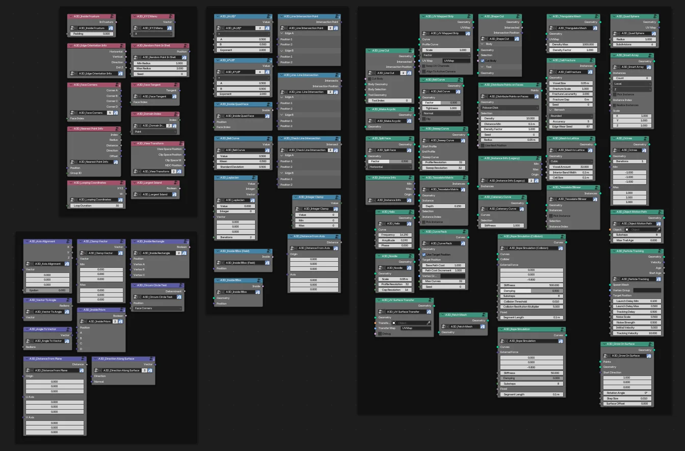 Procgen Toolkit is a comprehensive collection of over 60 Geometry Node groups designed to expand Blender's procedural generation capabilities. The toolkit provides advanced mathematical operations, spatial queries, and geometry manipulation tools that simplify complex nodal workflows.
