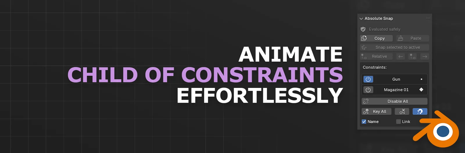 Absolute Snap is an animation and rigging add-on that manages object and bone transformations in world space. It provides tools to copy the exact world matrix of an object or bone and paste it onto a new selection, preserving the global position even when the target is affected by Child Of constraints.
