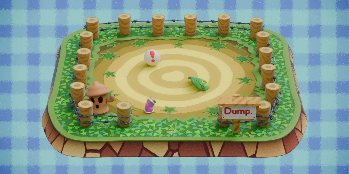 A procedural 3D diorama recreating the dump location from Animal Crossing, built entirely using geometry and shader nodes in Blender. The project serves as an educational example of procedural environment generation, allowing users to explore the node setups to learn how the scene was constructed. The node trees incorporate elements from the Higgsas Geometry Nodes Toolset and Erindale Toolkit.