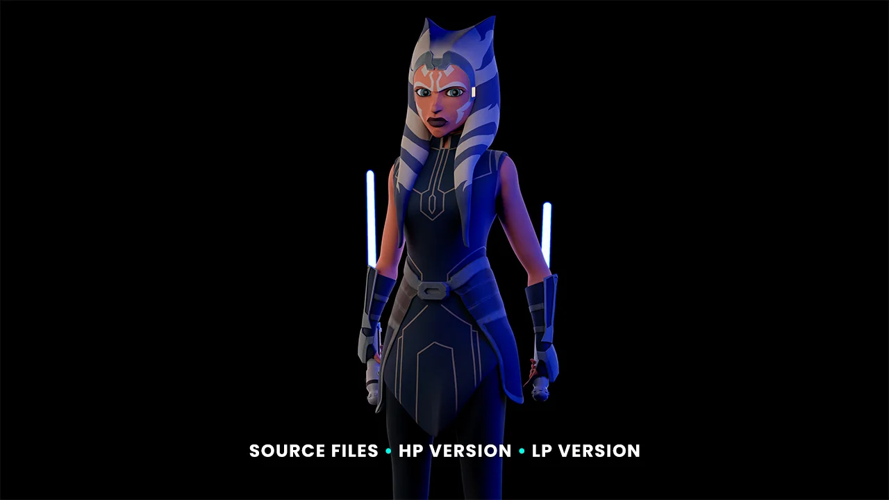 This asset provides the complete source files for a 3D fan art piece of Ahsoka Tano. The package includes multiple Blender project files containing the final render scene, detailed eye setups, lightsabers, a low-poly version, and a rigged character model. Additionally, it contains Substance Painter source files, a folder of 4K textures, and reference images.