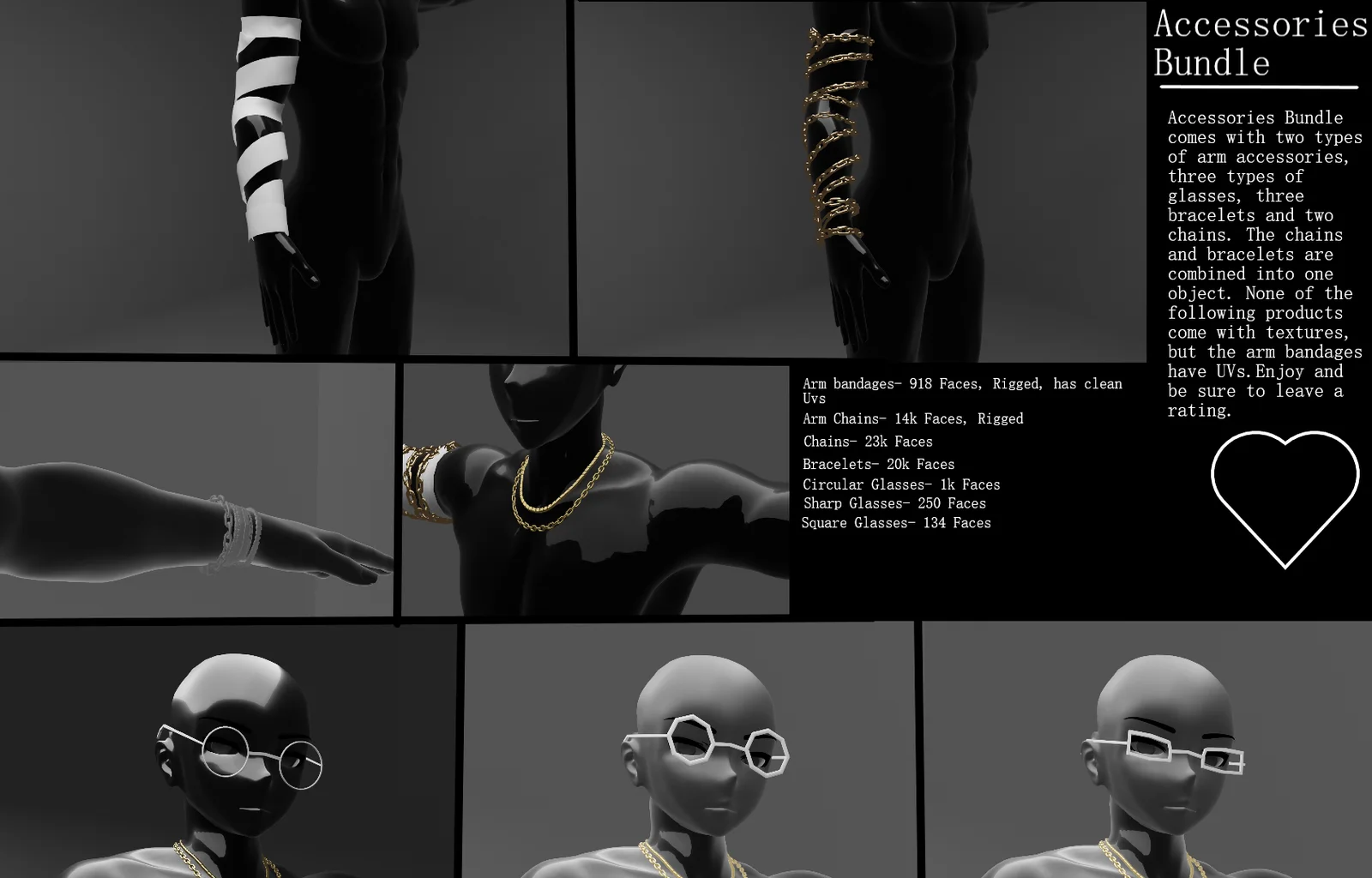 This collection provides an assortment of 3D accessory models designed to be added to existing character models. The pack includes UV-mapped and rigged arm bandages, as well as rigged arm chains. Additional unrigged props include standard body chains, bracelets, and three distinct styles of glasses: circular, sharp, and square.