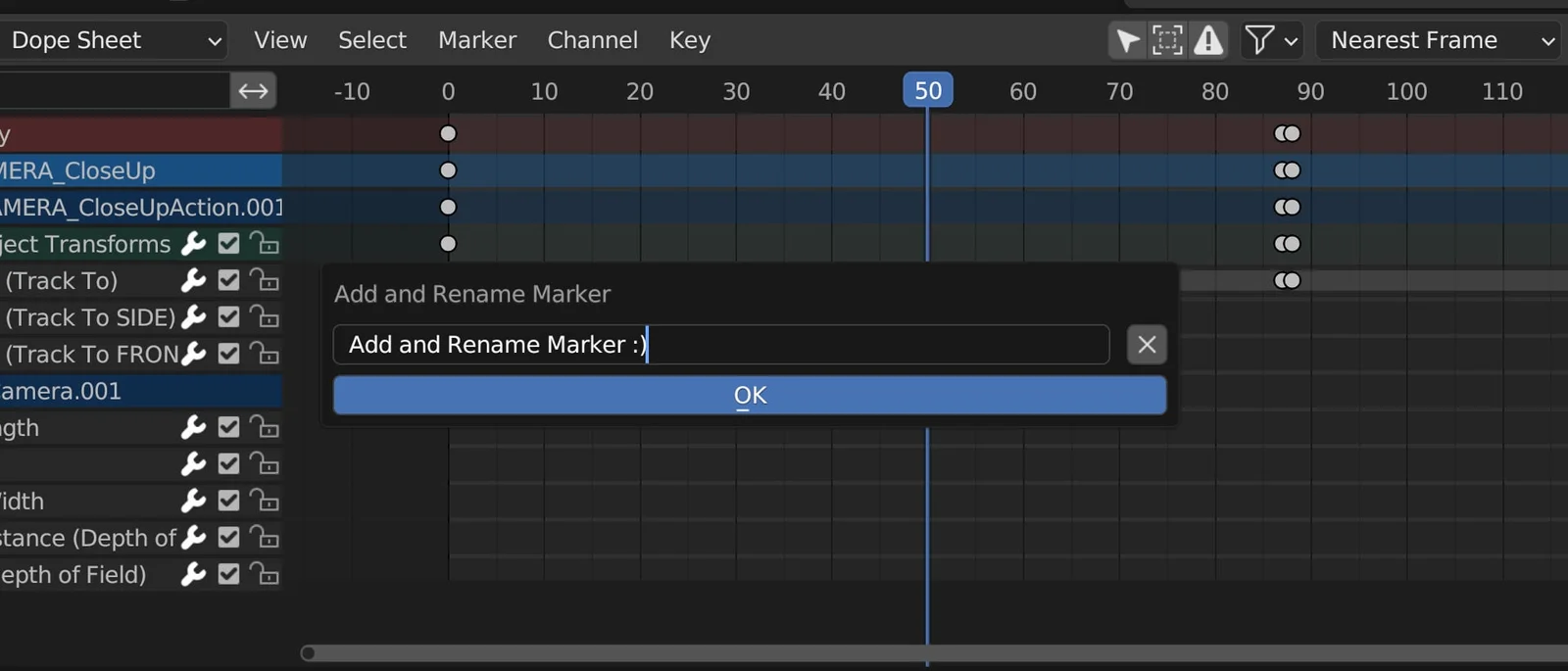 This add-on modifies the default behavior of timeline markers in Blender. When a new marker is added, it immediately triggers the rename pop-up dialog with the default text already selected, allowing users to type the new name instantly without additional clicks or hotkeys. Clicking outside the dialog cancels the renaming operation, returning the marker to its default state.