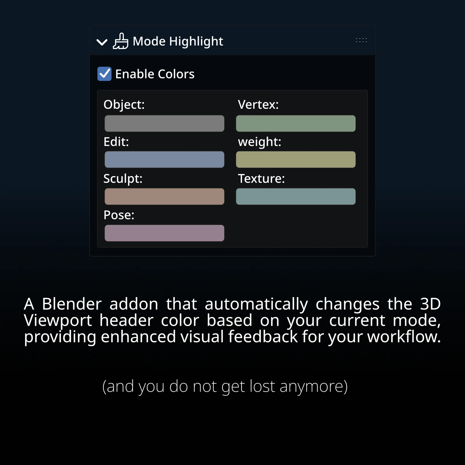 Mode Highlight is an interface add-on that automatically changes the color of the 3D Viewport header depending on the active workspace mode. It provides immediate visual feedback to help users quickly identify whether they are working in Object, Edit, Sculpt, Pose, Vertex Paint, Weight Paint, Texture Paint, or Grease Pencil Draw mode. Users can customize the specific color for each mode through a dedicated panel in the viewport sidebar, and these color preferences are saved globally across all projects.