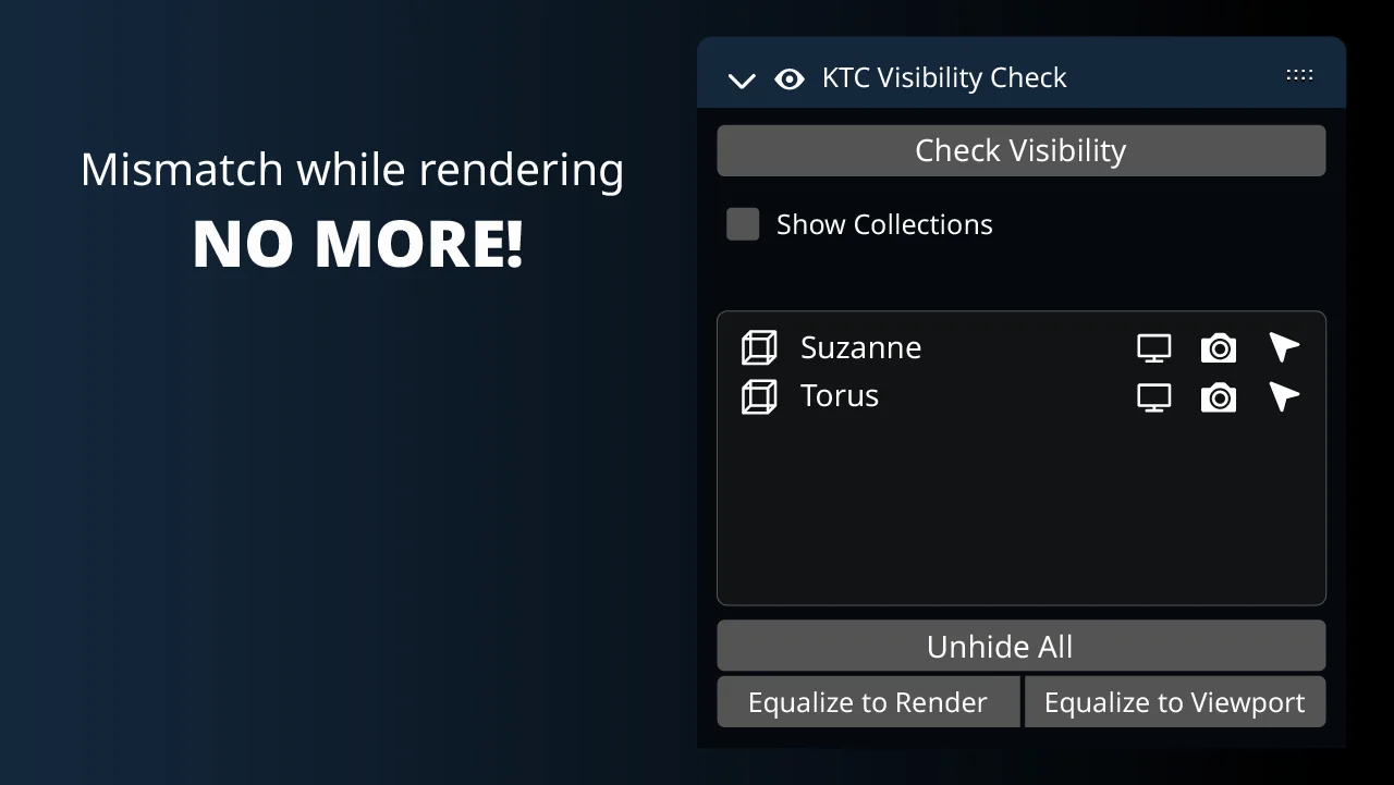 A utility for identifying and resolving visibility mismatches between the 3D viewport and final render. The add-on scans the scene to locate objects and collections that are hidden in the viewport but active for rendering, or vice versa. It provides a dedicated list interface where users can review mismatched items and select them directly. Included operators allow users to synchronize these states globally by either matching viewport visibility to render settings or matching render visibility to the current viewport configuration.