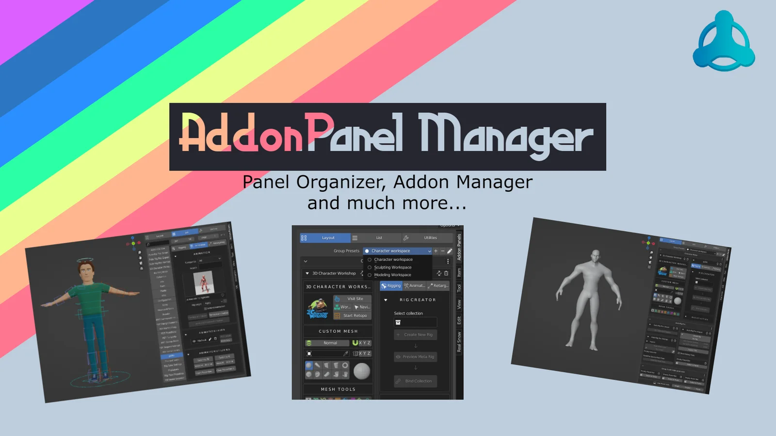 This add-on provides tools to organize and manage the N-Panel in Blender. It allows users to view multiple panels simultaneously and group them to reduce interface clutter. The add-on includes features to reorder panels numerically, load all panels automatically, and save or load layout presets for specific tasks.