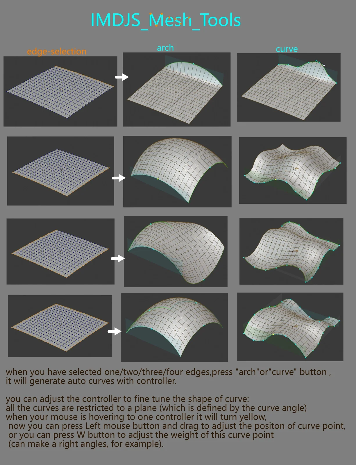 This mesh modification addon allows users to generate and manipulate virtual curves directly from selected edges. By selecting up to four edges, users can create adjustable curves manipulated by draggable handles restricted to a specific plane. The tool includes controls for adjusting point positions and weights, enabling the creation of both smooth arcs and sharp right angles.
