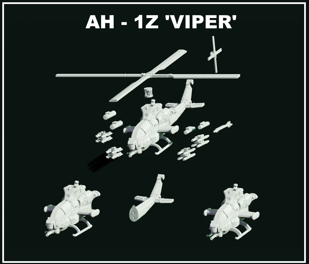 This is a 3D printable model kit of the AH-1Z Viper helicopter, provided as STL files. The model is scaled to 1/100 scale, which aligns with 15mm scale figures. The files include presupported versions for SLA printing.