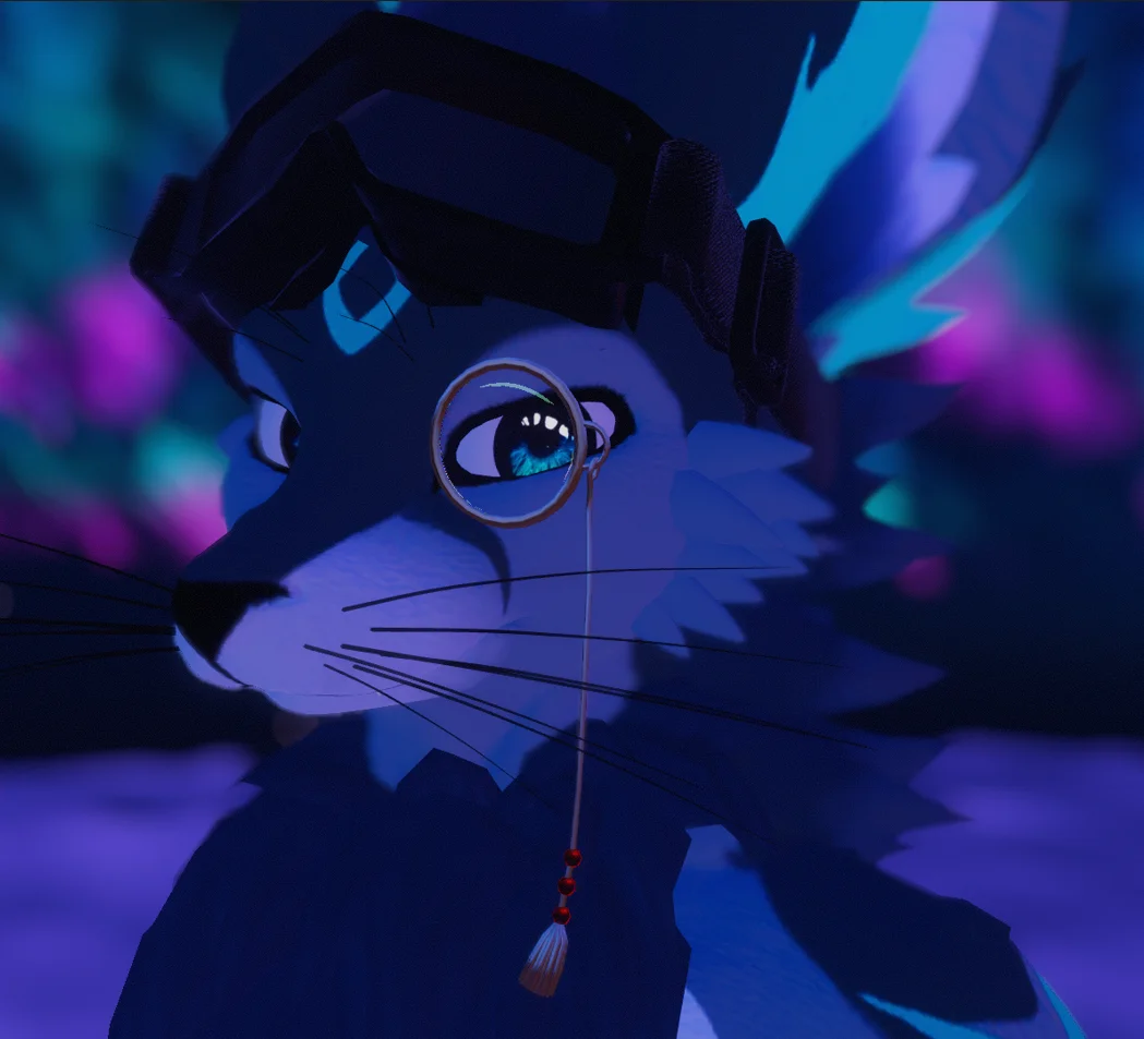 A 3D model of a monocle provided as a single mesh. The asset consists of 2,652 triangles and features three distinct material slots for the glass, frame, and beads. The package includes a native Blender file as well as a Unity package configured for VRChat with physbones and VRCFury.