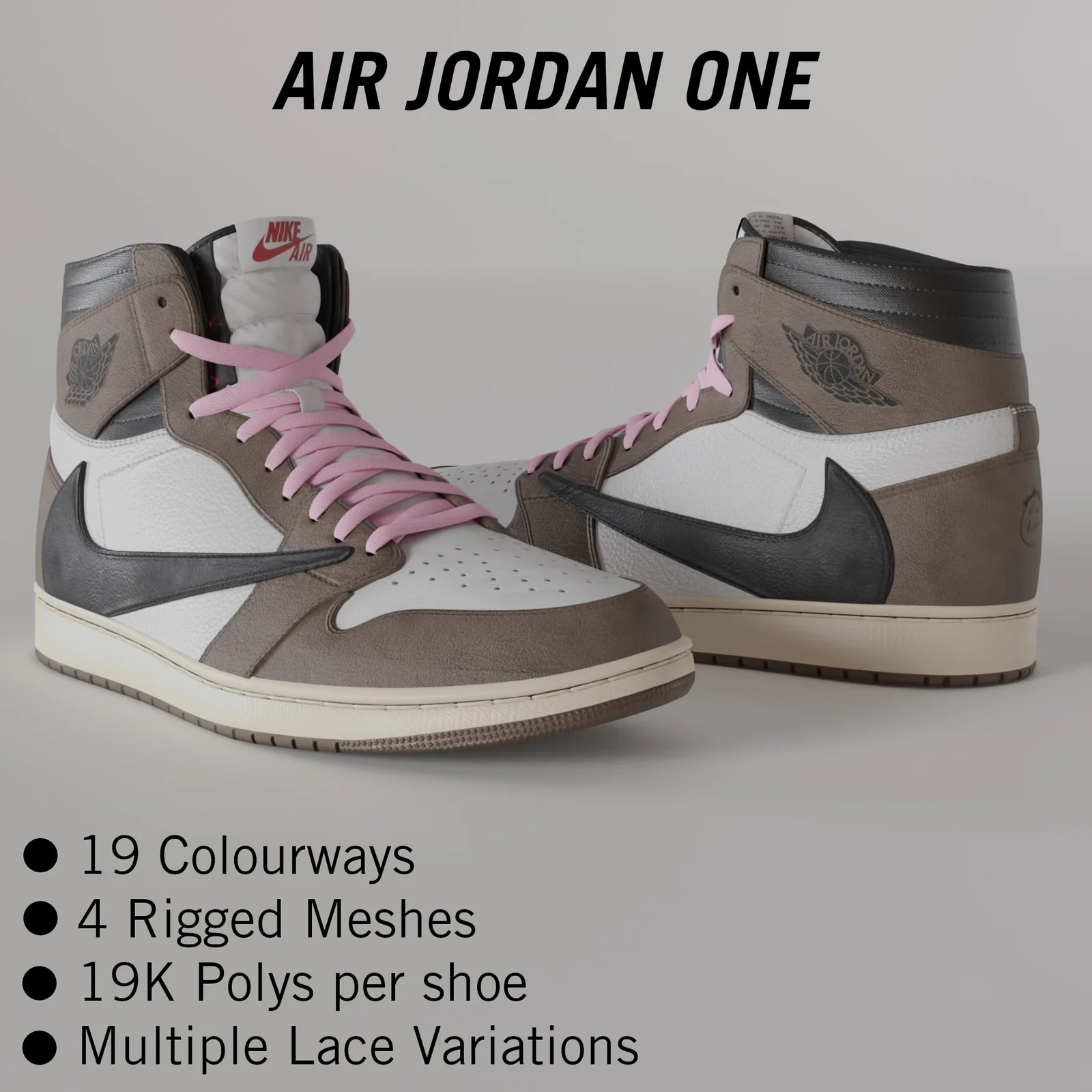 A collection of game-ready 3D models of the Air Jordan 1 sneaker. The package includes four distinct model variations: the standard Base, Union LA, Dior, and Travis Scott editions. The shoe geometry is optimized for real-time engines, featuring a baked normal map on the sole to reduce the overall density to roughly 19,000 polygons per shoe.