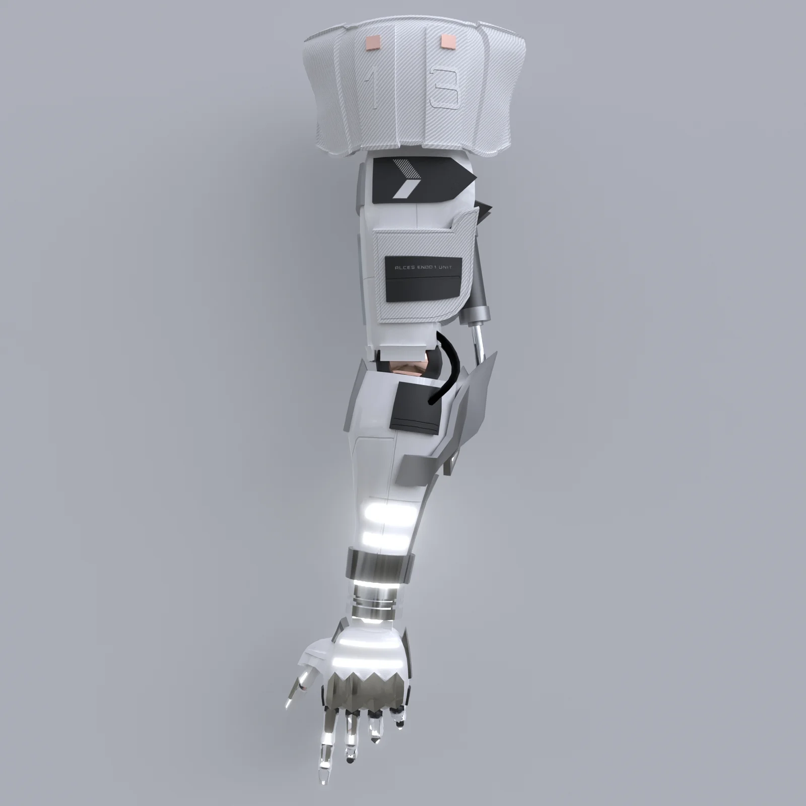 Endo 1 Cyber Arm is a quad-based 3D model of a bionic limb. The asset is fully rigged and weight painted, consisting of 14,679 triangles. It includes 4K PBR textures configured for a single material. The download provides four texture variations, offering both detailed and blank designs in black and white color schemes.