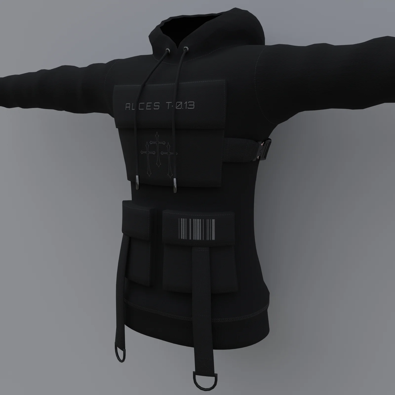 The T-0.13 Hoodie is a 3D clothing asset featuring an oversized fit with integrated thumbholes. The model is built from a quad-based mesh containing just over 17,000 triangles and is fully rigged, including weight-painted straps and drawstrings. The asset uses a single material setup and comes with two 4K PBR texture options—a detailed version and a blank version—prepared in Substance Painter.