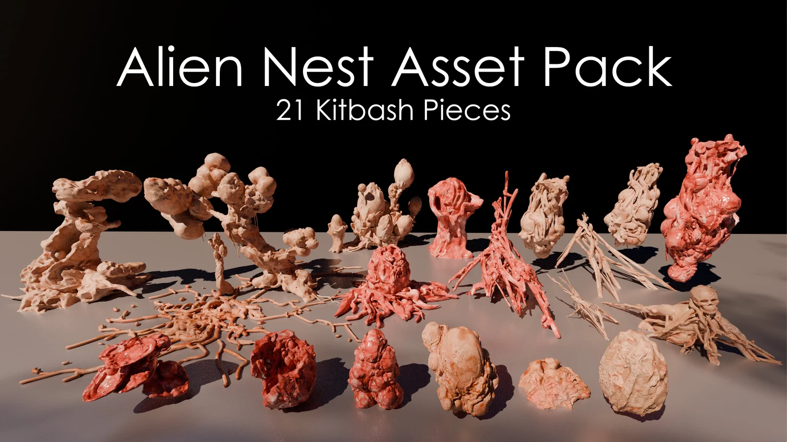 The Alien Nest Asset Pack is a collection of 21 kitbash models designed for use in concept art workflows. The assets were initially created using a combination of Adobe Medium, 3DCoat, and Blender. These models have been decimated to optimize performance within a concept art pipeline, with polygon counts ranging between 20,000 and 320,000 faces per object.