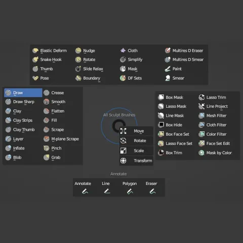 This add-on provides a compact pie menu that displays all sculpt mode brushes alongside their names. It surfaces brushes that are normally hidden within the active tools menu, offering an alternative to the default spacebar menu. The interface includes official tooltips for every brush, sourced directly from the Blender manual, which are typically absent in the default interface. Users can assign a custom keyboard or mouse shortcut through the add-on preferences.
