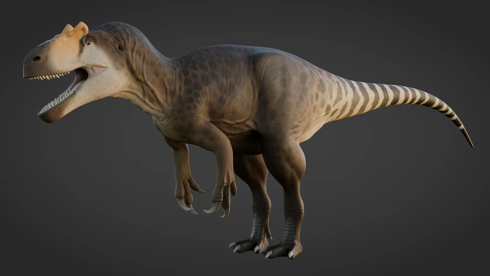 A rigged 3D model of an Allosaurus dinosaur, designed with anatomical accuracy. The base mesh consists of 34,000 vertices and includes a simple IK rig for posing and animation. The asset comes with a complete set of five textures, including diffuse, normal, specular, roughness, and specialized iris diffuse maps.