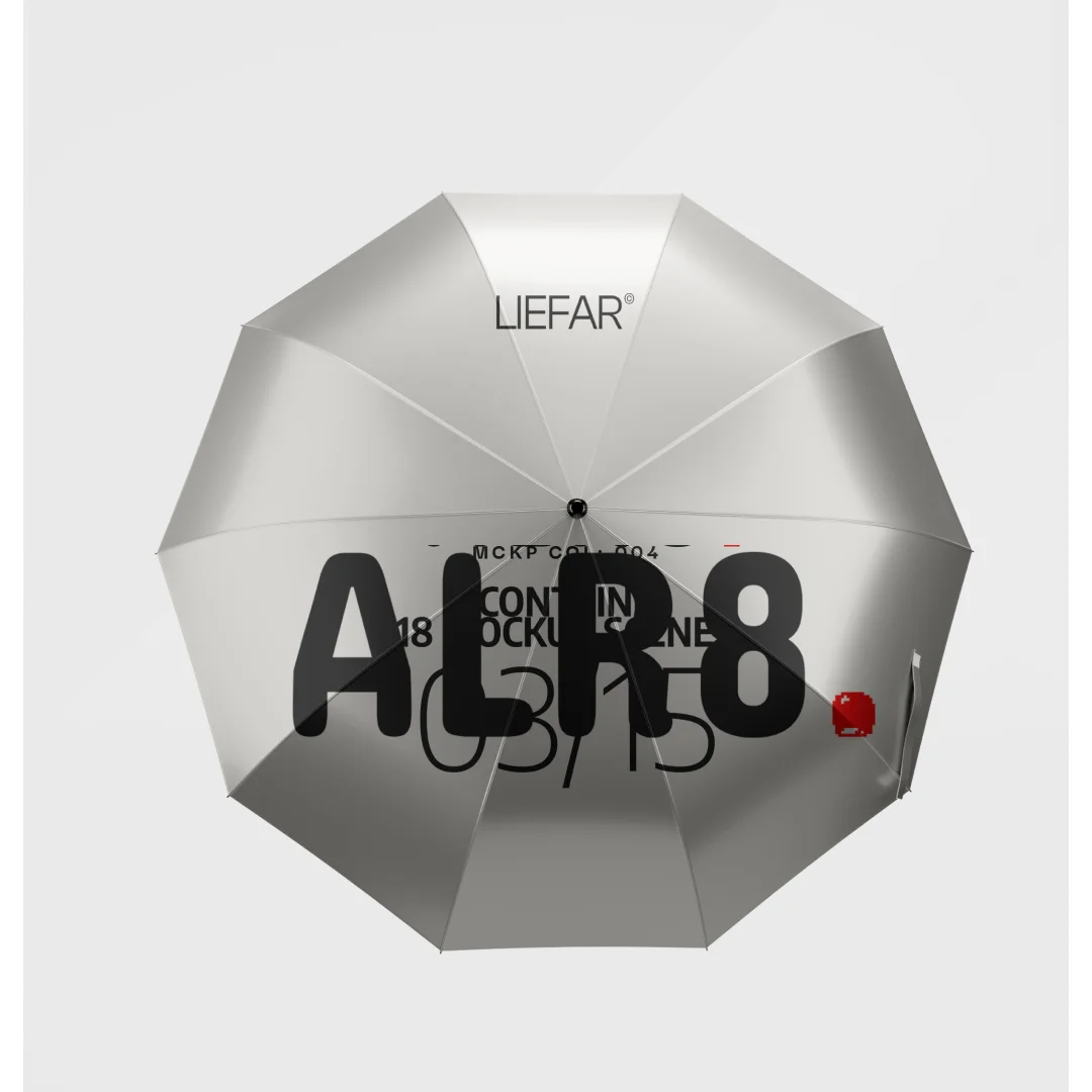 This product is a render-ready animated umbrella mockup provided as a Blender scene file. It features structured materials and dedicated label slots, allowing users to insert their own graphic designs for presentation renders. The package includes the main Blender file, a Photoshop template for preparing decals, and a PDF user manual.