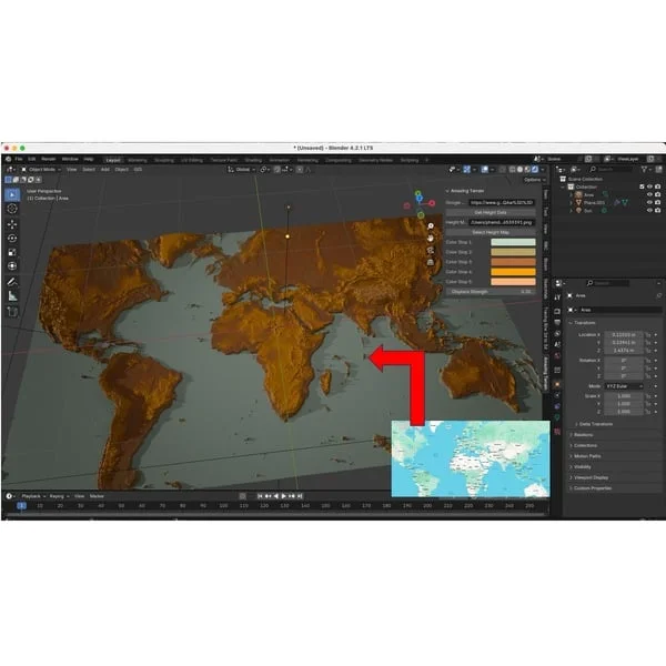 Amazing Terrain is a Blender add-on that converts 2D images sourced from Google Maps into 3D terrain geometry. The tool provides options to adjust the overall height and elevation of the generated terrain. Users can configure color stops to assign specific colors to different elevation levels, allowing for customized stylized or realistic landscape appearances.