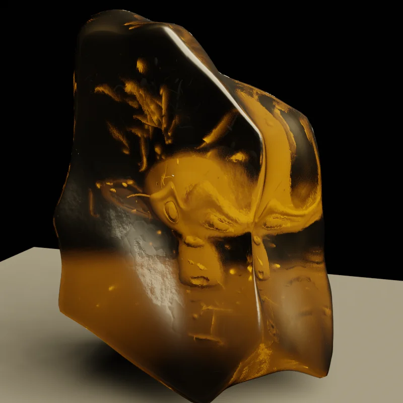 A node-based amber material setup provided within a Blender scene file. The included scene and material are configured specifically for the EEVEE render engine. Users modifying the scene structure or lighting will need to rebake the indirect lighting cache to maintain accurate material appearance.