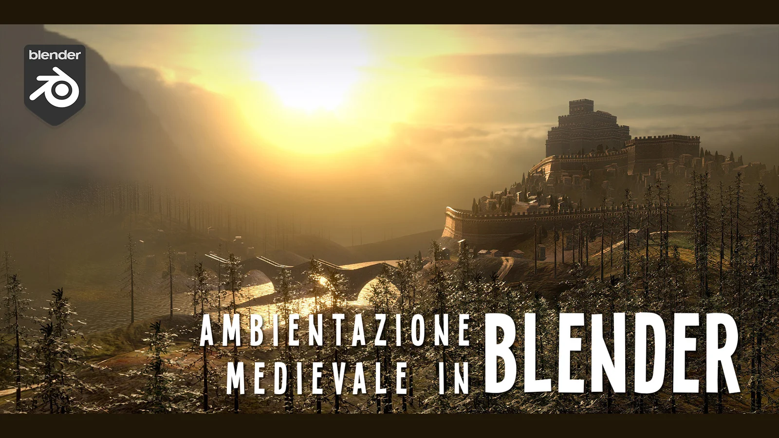 An Italian-language tutorial series covering the creation of a medieval or fantasy-inspired landscape using procedural workflows. The course covers terrain creation using weight painting and displacement, moving on to modeling individual elements like trees, houses, and castles. It explores various techniques, including photo-based texturing and low-poly modeling, and demonstrates how to populate the environment with instanced objects. Later chapters detail material creation from photographs and setting up realistic lighting for both the EEVEE and Cycles render engines.