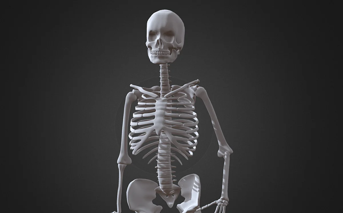 A rigged 3D model of a human female skeleton built entirely with quad topology. The provided rig includes IK/FK systems for the hands and feet alongside snapping functionality. The model comes with 1024x1024 base textures and a material setup pre-configured for the Cycles render engine. It is natively structured to integrate with the X-Muscle System add-on, though it acts as a base skeleton and does not include muscle geometry.