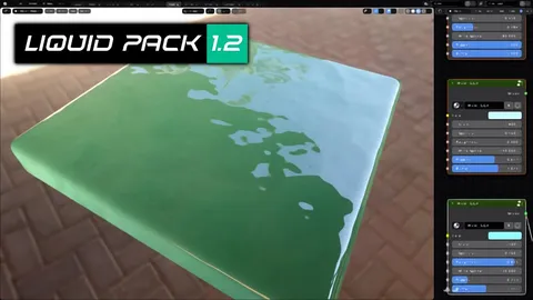 This package provides animated water and liquid materials for use in EEVEE and Cycles. It includes several built-in presets that give a starting point for different liquid types, with settings that can be customized to adjust the appearance. The materials are designed for optimized performance, with an included option for more complex realistic waves.