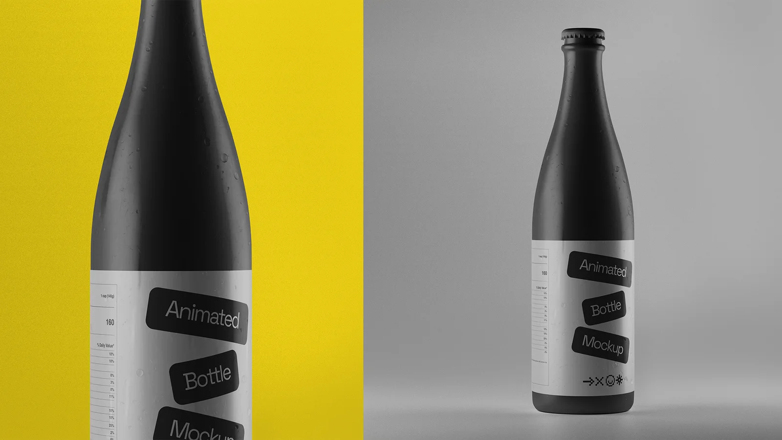 This product is an animated 3D model of a wine bottle featuring falling condensation droplets generated using procedural nodes. The asset includes a pre-configured six-second animation with realistic textures and a setup that automatically matches reflections to the background color. An included Adobe Photoshop (.PSD) project file facilitates post-processing and compositing tasks.