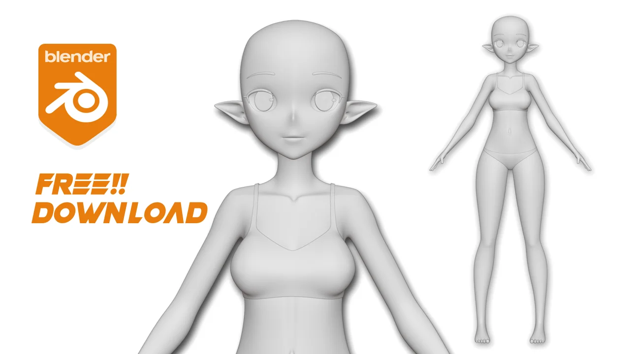 This anime-style character base mesh includes elf ears and is provided untextured. It is intended to serve as a starting point for character modeling workflows, allowing users to practice UV unwrapping and texturing techniques. The mesh can also be used as a structural reference for studying character topology.
