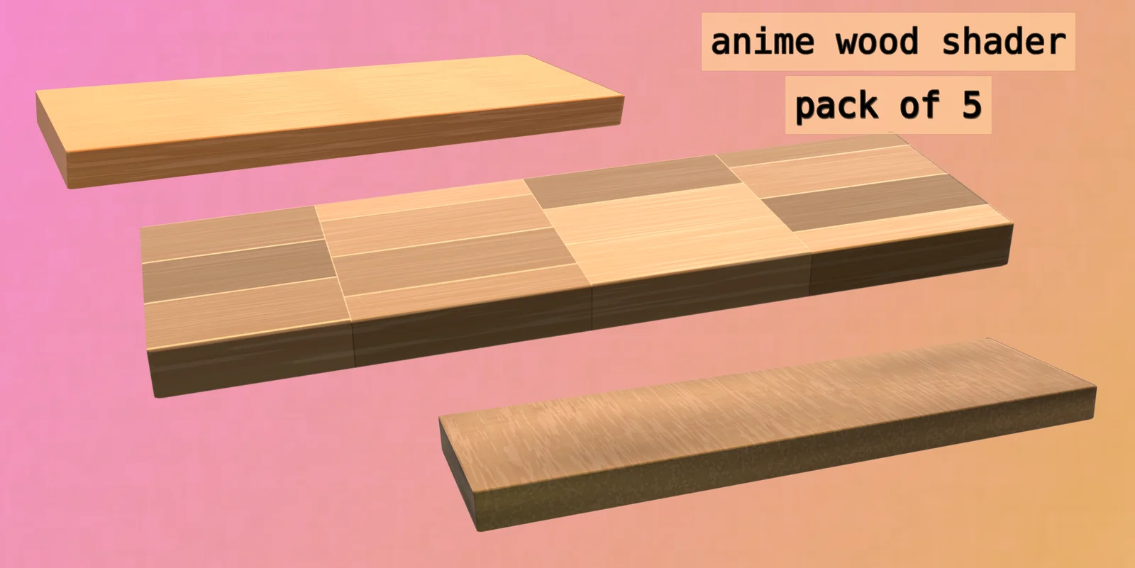 A collection of five anime-style wood shaders designed for stylized environments. The pack includes two dedicated floor wood shaders and three versatile wood materials. Each shader is designed to react dynamically to scene lighting, helping to achieve a consistent toon or anime aesthetic. The materials feature centralized controls for straightforward customization.