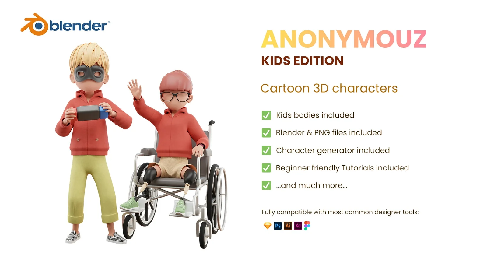 A library of rigged 3D kid characters designed with faceless, minimalist heads suitable for corporate websites, marketing materials, games, and AR/VR projects. The package features fully rigged bodies with three skin tone options (white, brown, and black). It includes a modular wardrobe consisting of 10 tops, 10 pants, 10 pairs of shoes, 10 hairstyles, and 10 accessories, which can be combined using the included Blender character generator.