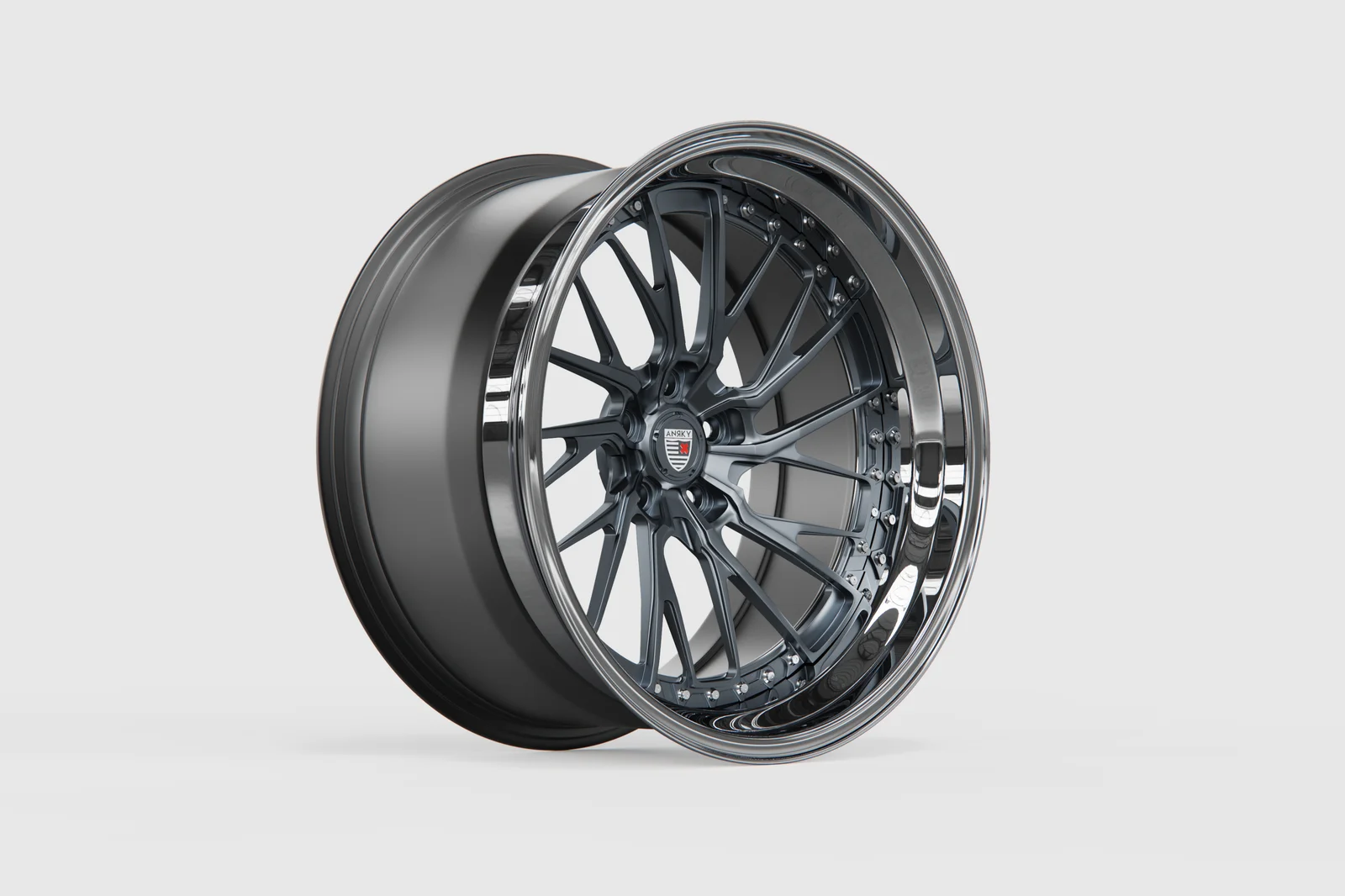 A 3D model of the Anrky RS3 Series Three custom finish wheel. The asset represents a three-piece rim design and is provided with multiple offset and concave setup variations.