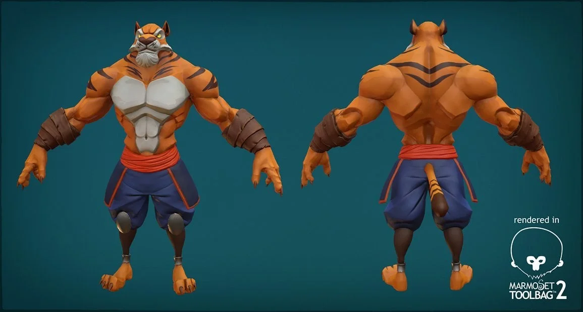 This rigged anthropomorphic tiger character model features an armature designed for animation. The setup includes IK/FK switching for the arms and both dynamic and forward kinematics controls for the tail. Animators can also utilize a dedicated breathing control handle and layered controls for adjusting the character's posing and movement.