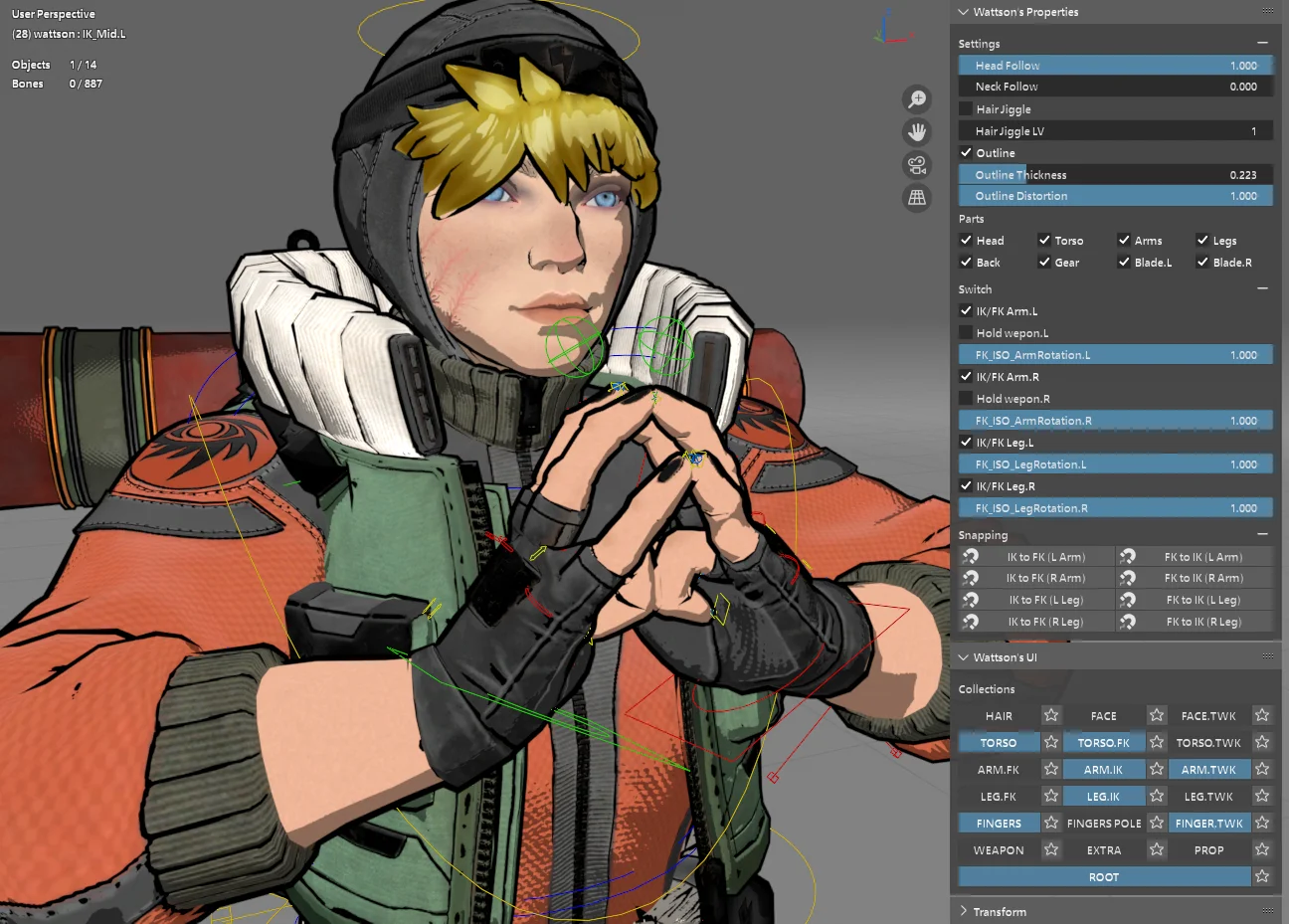 This is a fan-made character rig of Wattson from Apex Legends, utilizing extracted game assets. The rig features IK/FK limbs with locking, a stretchable torso, and a fully pose-driven facial setup. It includes an advanced spine system, finger IK, and fake physics automation for the character's hair and clothing. The model also incorporates a procedural toon outline generated through Geometry Nodes and geometry masks for stylization.