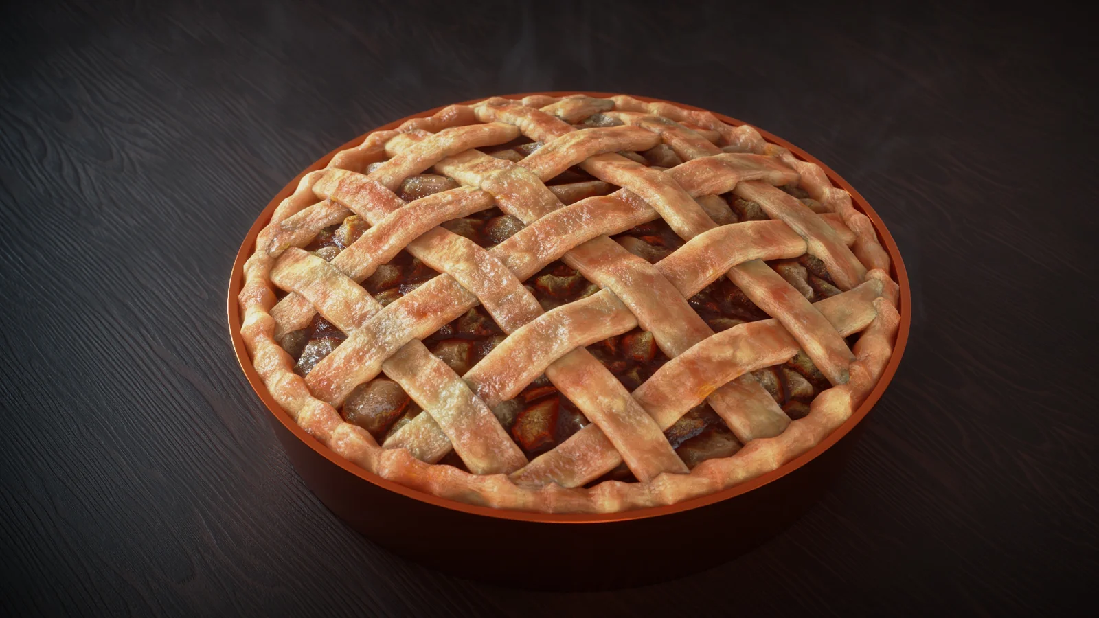 A complete scene file for a realistic dessert, built within Blender and prepared for the Cycles render engine. The project features four procedural materials created using Blender's shader nodes: filling, crust, crust edge, and a procedural steam effect. The crust and filling materials utilize displacement for surface detail. The package includes the finished blend file, wood table texture maps, and the HDRI environment lighting setup.