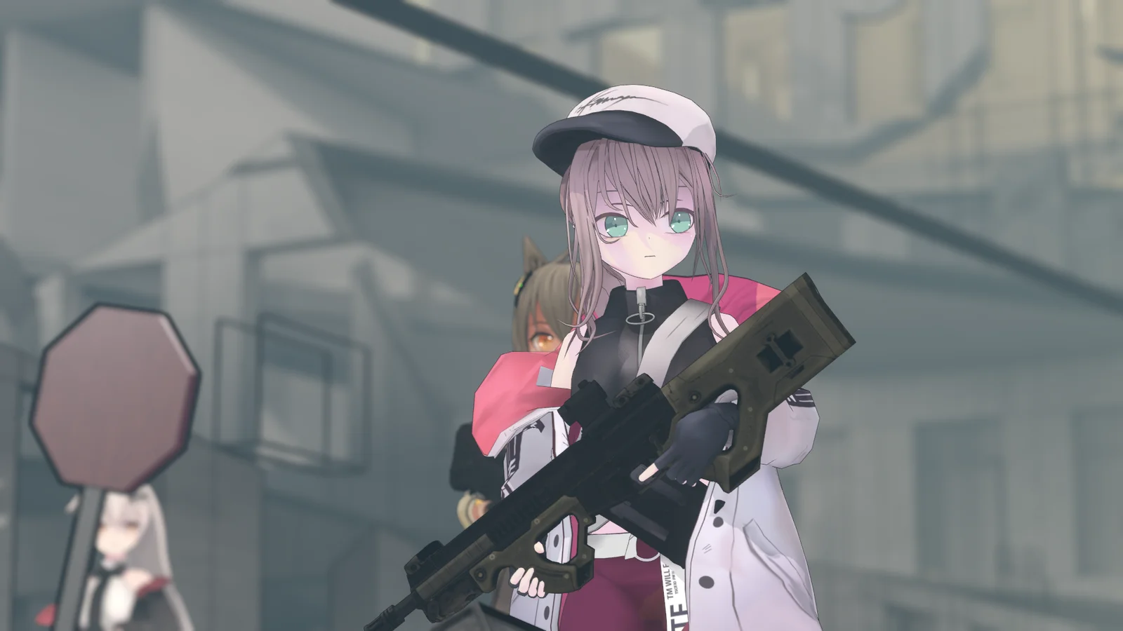 A rigged, weighted, and textured fan-made character model based on Girls' Frontline. The rig features an IK/FK switch for the limbs and spine, alongside isolated rotation toggles for the limbs and head. Facial expressions, including eye sparkles, blush, blinks, and various mouth poses, are driven by bone-controlled shape keys. The hair, chest, and tie bones are prepared for use with the Wiggle Bone add-on. The geometry consists of approximately 44,000 vertices and 87,000 triangles when the outline solidify modifier is active. An experimental VRM file is also included for use in VTuber software. Note that the model is not fully UV mapped.