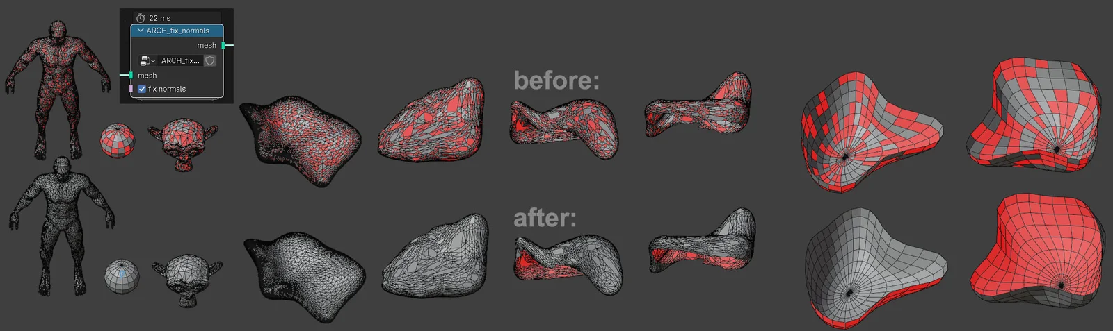 Arch Fix Normals is a Geometry Nodes setup designed to correct and unify normal orientation on 3D meshes. The tool enables procedural normal correction directly within node trees, offering the same functionality as the native recalculate normals command in Blender's edit mode.