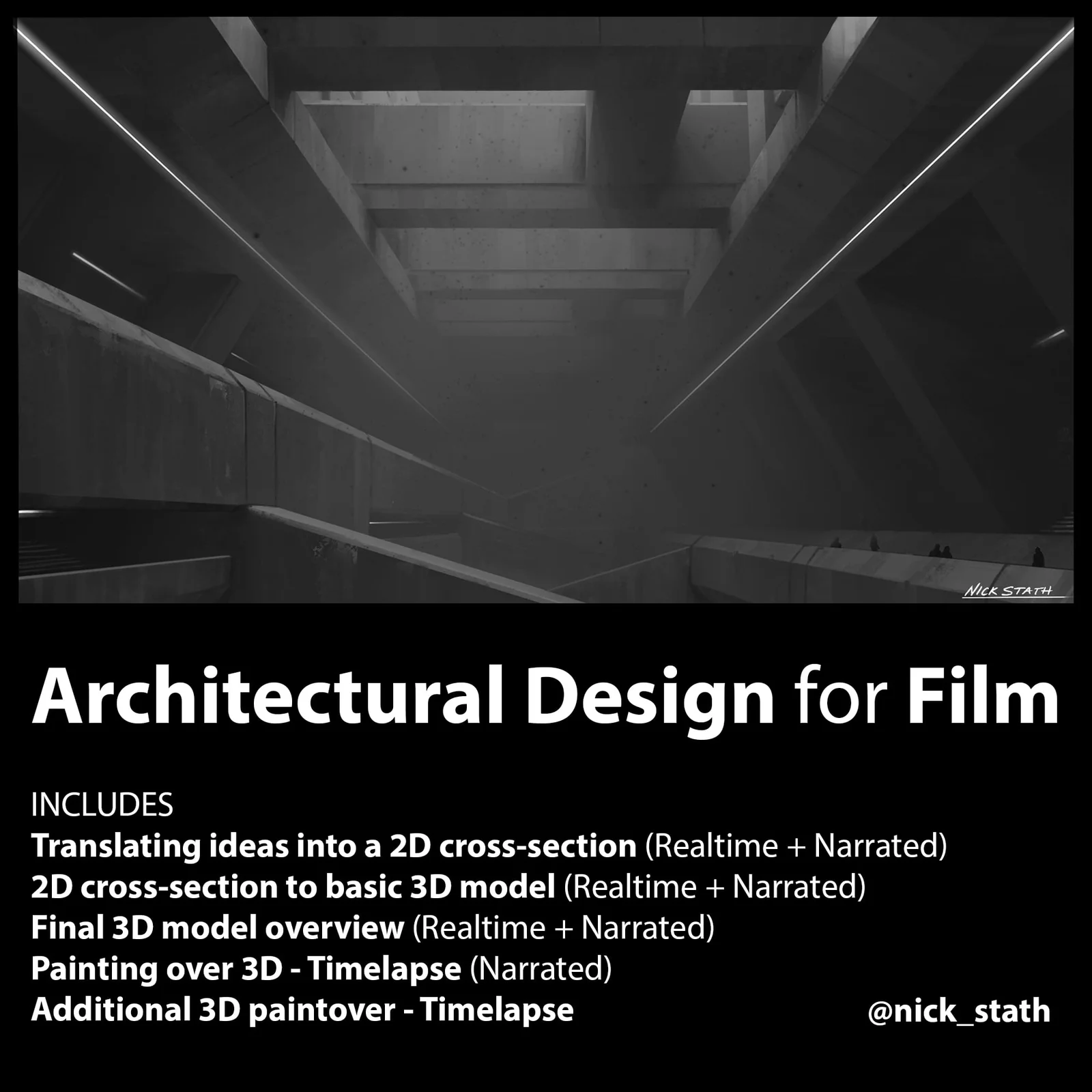This tutorial covers a workflow for designing architectural environments meant for film, combining 2D sketching and 3D modeling techniques. The course spans over 45 minutes of narrated video detailing the process from initial concepts to final concept sketches.