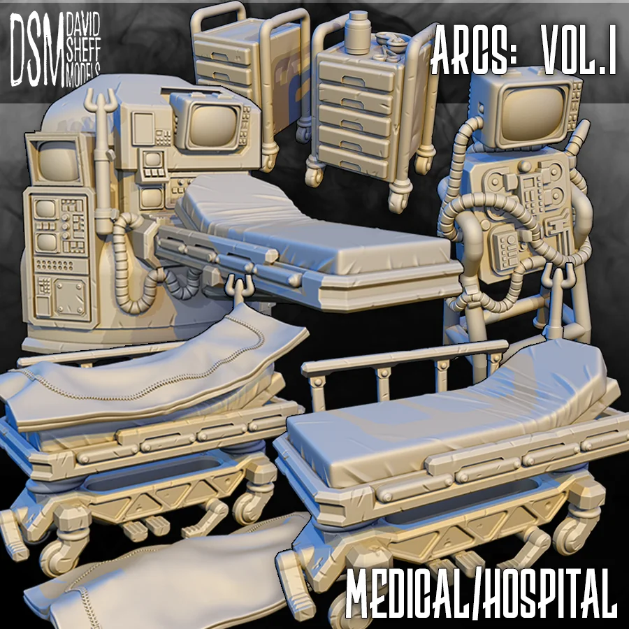 A collection of 3D printable sci-fi medical and hospital models designed for 28mm heroic scale miniatures. The set includes body bags, diagnostic beds, two variations of medical drawer units, a gurney, and a medical monitor. These high-quality STL files are intended for resin printing.