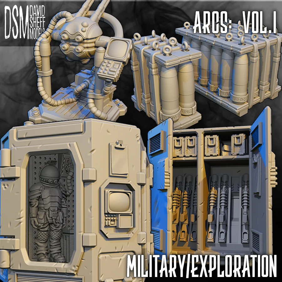 A collection of science fiction 3D models designed for 28mm heroic scale miniatures. The set includes a drone charging dock, explorsuits, ordnance, and a weapons locker that comes with a template for cutting physical window inserts.