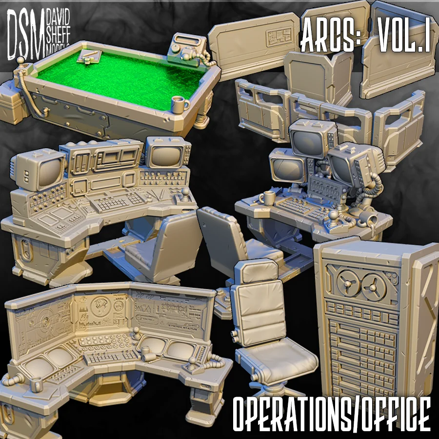 This collection includes a variety of sci-fi themed office and operations room furniture designed for 3D printing. The set features a chair, computer server, console desk, corner desk, eight variations of room dividers, a standard desk, and a holotable with four insert variations. The models are scaled for 28mm heroic scale miniatures and are optimized for resin printers. Files are provided in STL format, with both pre-supported and unsupported versions available.