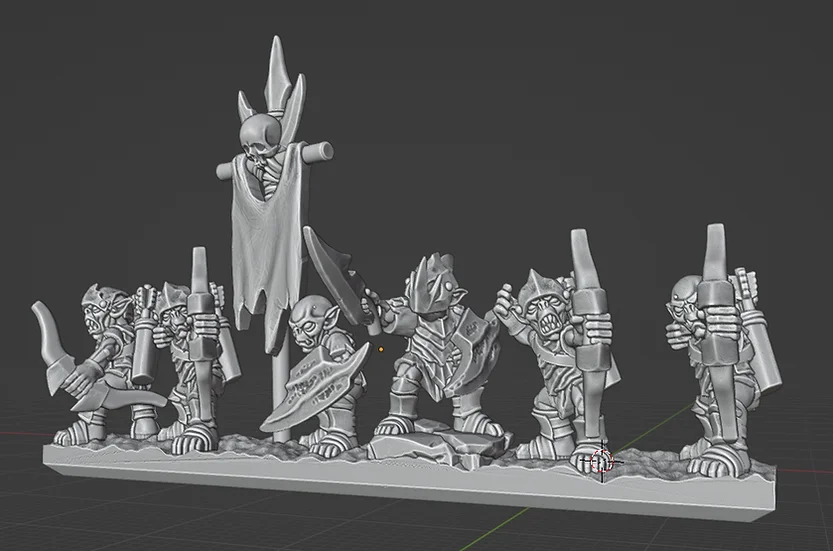 This collection features 10mm scale 3D printable miniature models of Under-mountain goblins designed for tabletop gaming. The bundle includes both individual miniatures and unit strips covering archers, swordsmen, armoured spearmen, standard spearmen, skirmishers, and hero figures. All files are provided in both pre-supported and unsupported formats, optimized to be printed flat on the build plate of a resin 3D printer.
