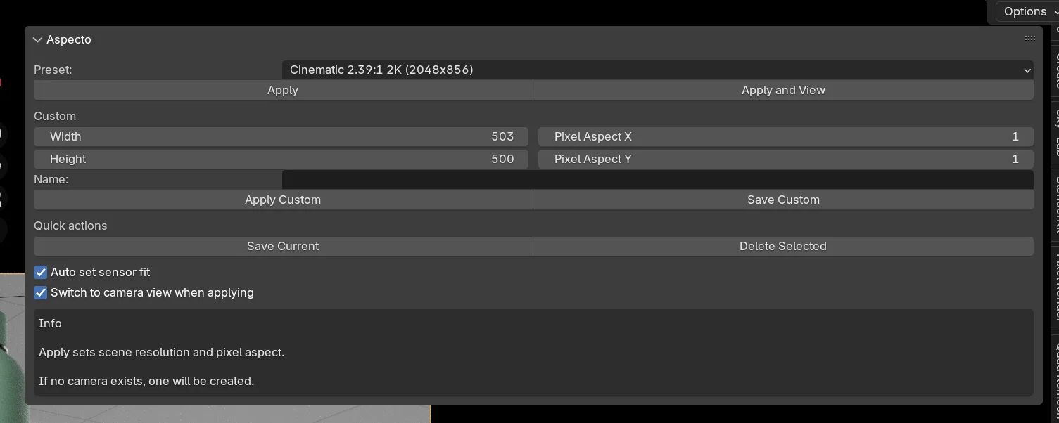 Aspecto provides an interface for managing camera resolutions and aspect ratios in Blender. Users can switch between common formats like cinematic, vertical, and square with a single click. The tool also supports creating and saving custom resolution presets for repeated use across different projects.