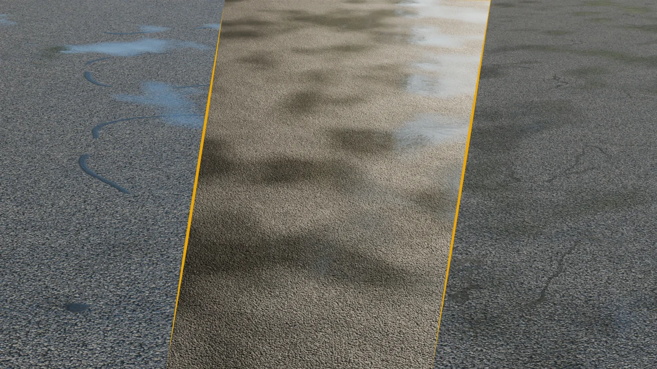 A collection of three procedural asphalt material variations built for Blender. The materials use object texture coordinates by default, eliminating the need for UV mapping out of the box. Designed specifically for the Cycles render engine, these setups accomplish their look without relying on displacement maps.