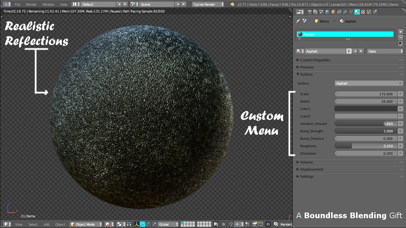 This is a procedural asphalt shader designed for Blender's shader editor. It features 9 customizable settings that allow users to adjust the appearance of the asphalt surface directly within the material node group. While originally created for Blender 2.7x, it functions as a node-based shader.