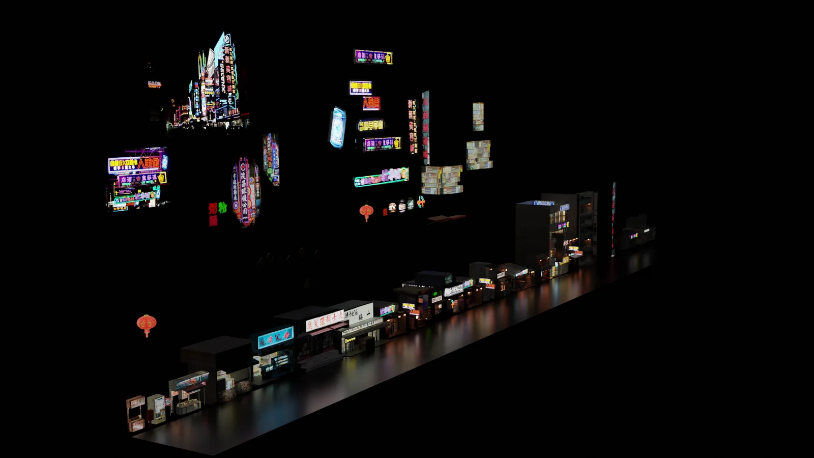 A collection of 3D models featuring Chinese and Japanese storefronts and signage. These assets are built with a rough, low-detail style, intended to be used as background or mid-ground elements for populating urban environments and cityscapes.