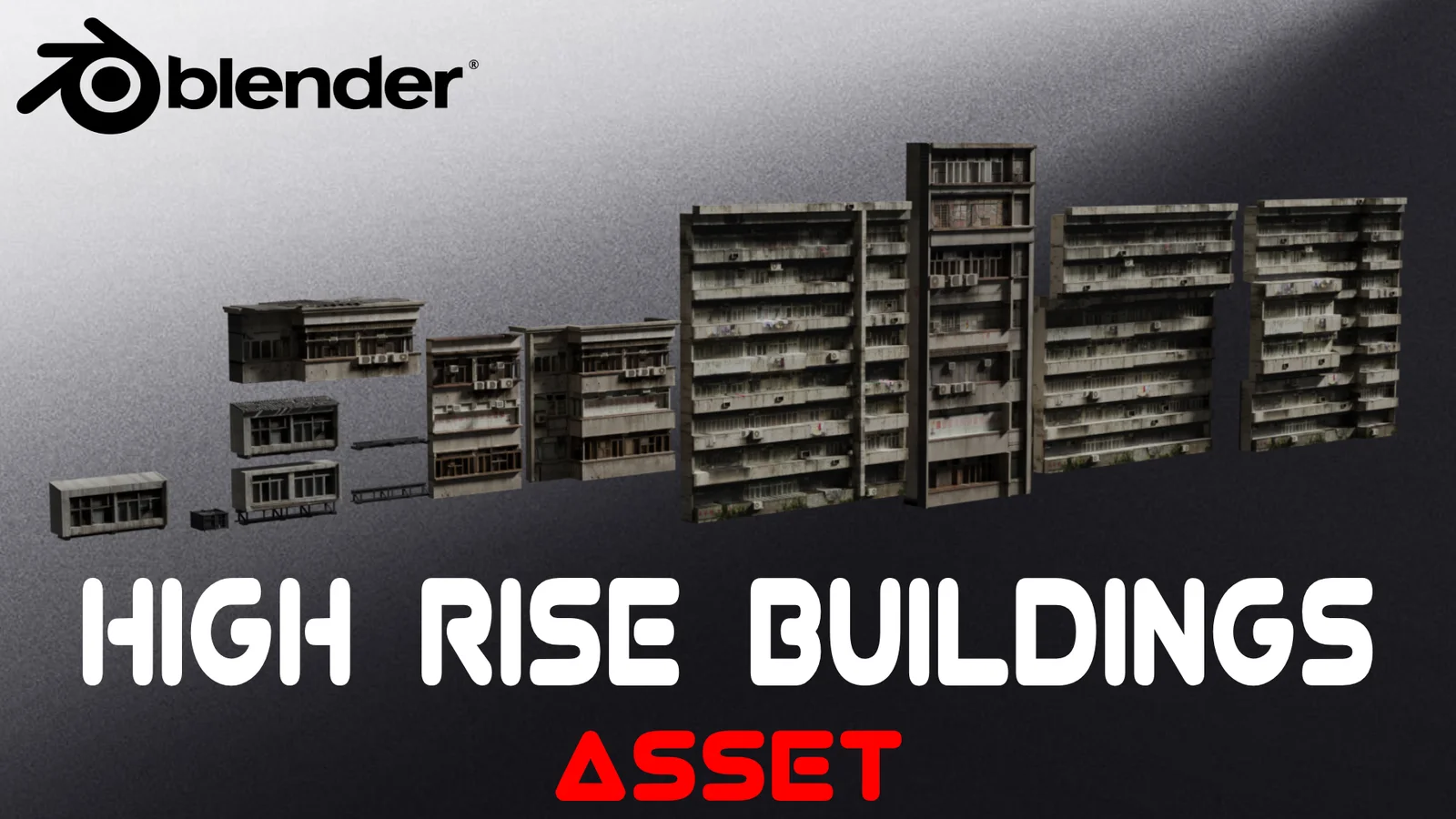 A collection of 3D models featuring modular high rise buildings. These assets are intended primarily for use as background elements in urban scenes and cityscapes. The files are provided in both native .blend format and interchangeable .fbx format.