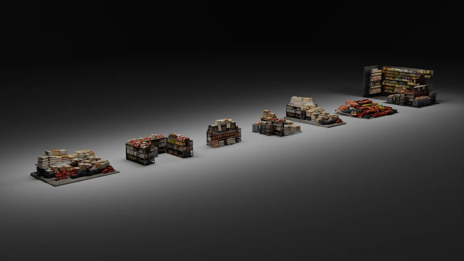 A collection of seven modular market stand models designed for scene decoration. The assets are optimized specifically for placement in the mid-ground or background of animations and renders. To reduce polygon counts, the structures are built using one-sided geometry, meaning the rear sides of the stands are not detailed.