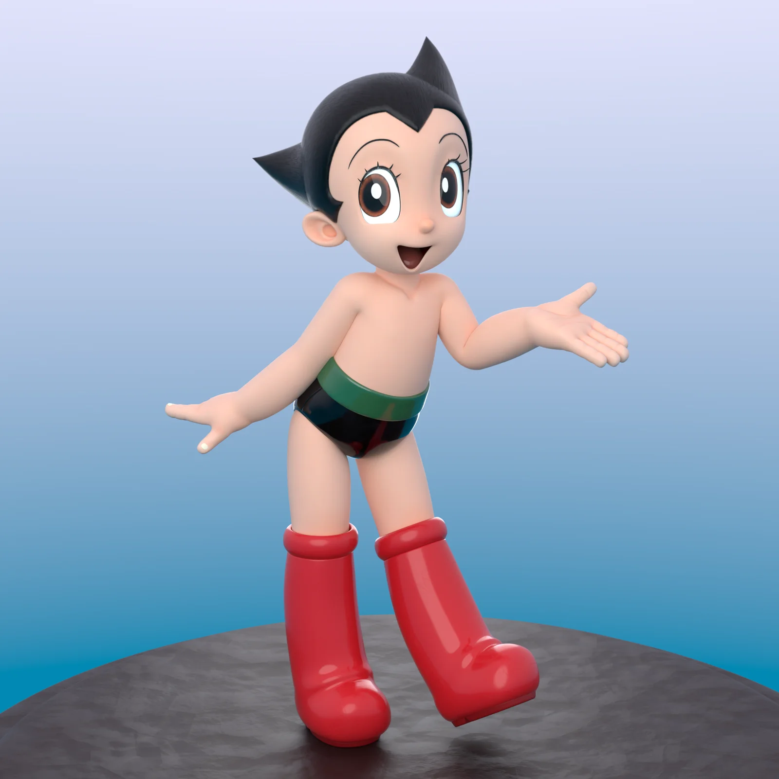 A fan-made, rigged 3D character model of the classic manga character Astro Boy. The model features a traditional, rounder design and includes mechanical details like leg rockets, arm cannons, rear guns, and an accessible chest compartment. It is equipped with a Rigify armature designed for animation. Facial controls include individually posable hair elements, combined weighted and shapekey-driven eyelids, and a bendy rig for the teeth to allow for broad expressions.