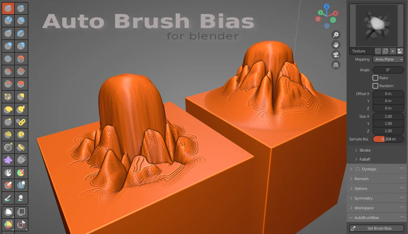 Auto Brush Bias is an add-on that automates the setup of alpha maps for sculpting and texture painting. It analyzes the image content of the loaded texture to determine and apply the correct brush bias with a single click. The tool calculates the appropriate bias level by identifying either the brush's border value or the dominant color in the alpha map.