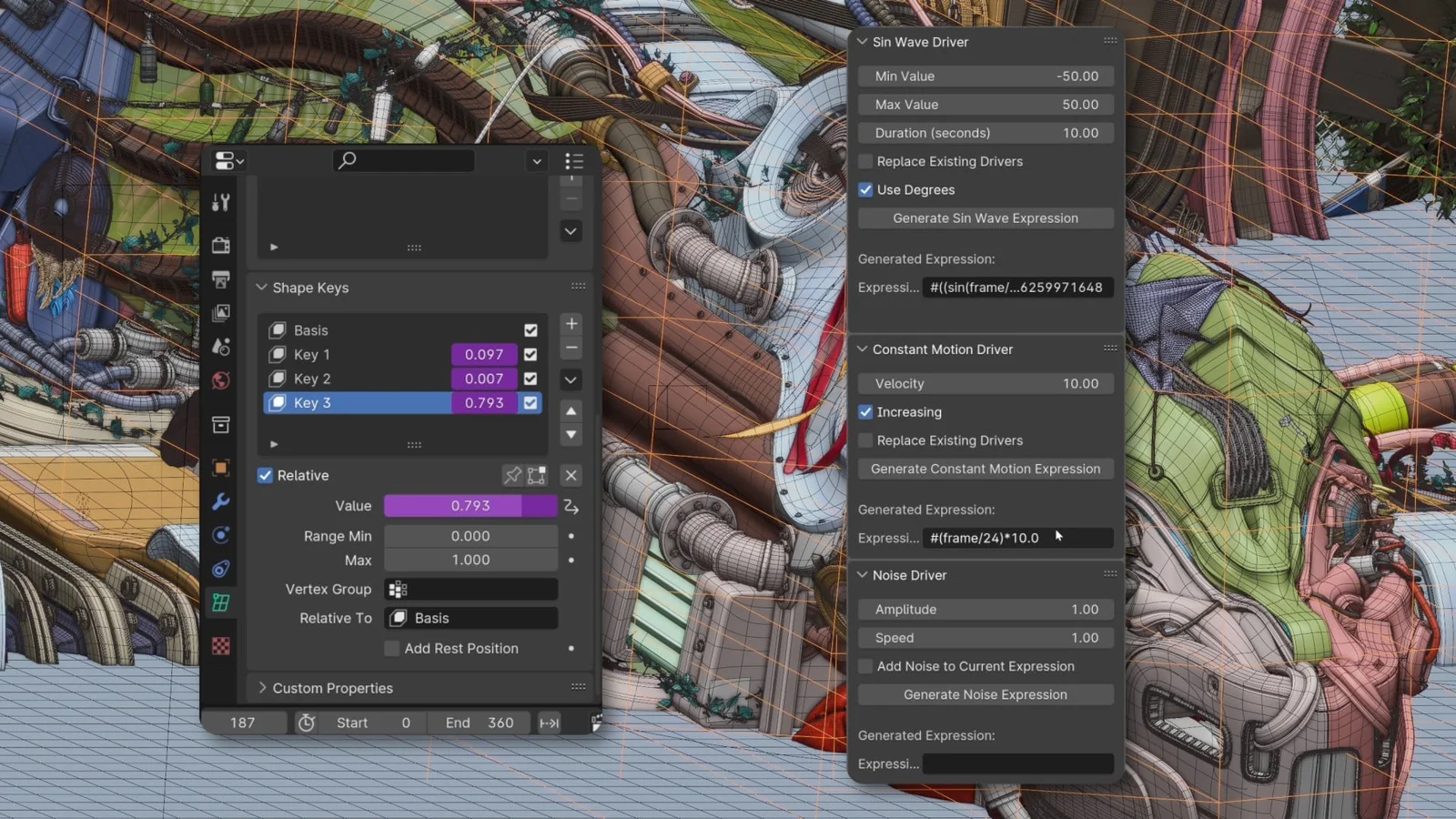 The Automatic Driver Generator is an add-on that simplifies the creation and management of drivers in Blender. Users input desired values through a sidebar panel, and the tool generates the appropriate driver expression to paste into any property field, such as shape keys, lattices, or shader node parameters.