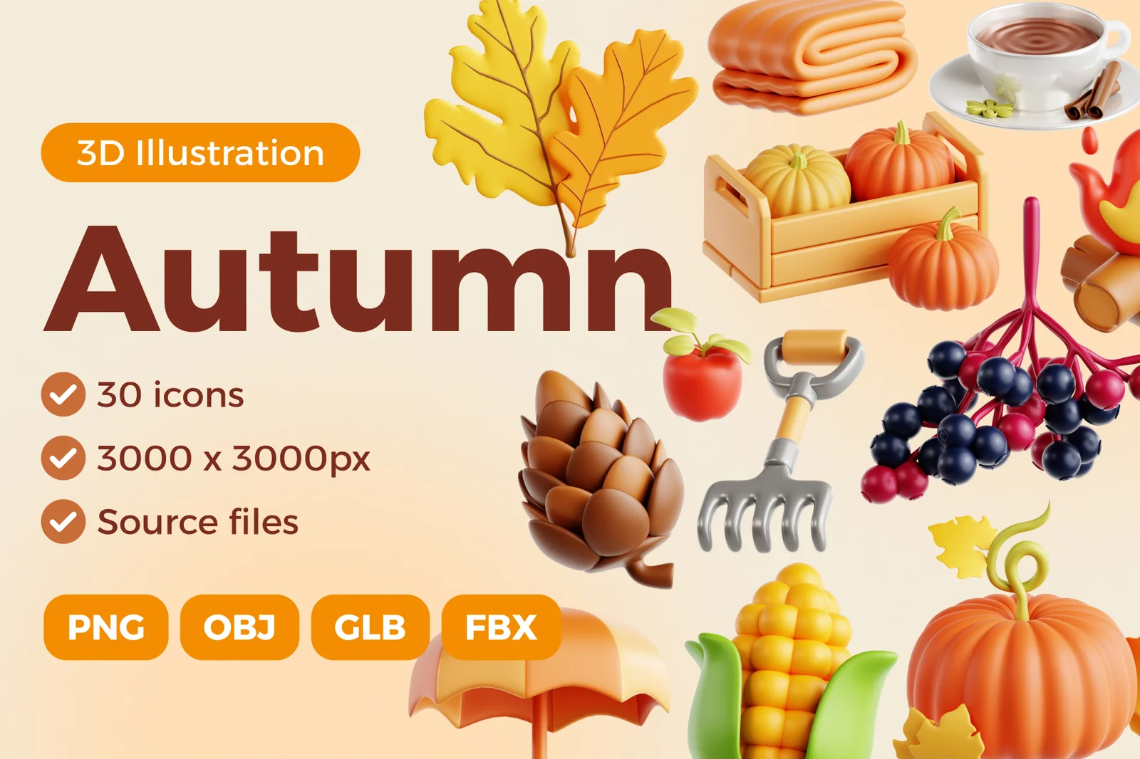 A collection of 30 autumn-themed 3D icon models designed for use in user interfaces, mobile apps, and web design projects. The set includes pre-rendered high-resolution transparent images alongside the original 3D source files in multiple industry-standard formats.